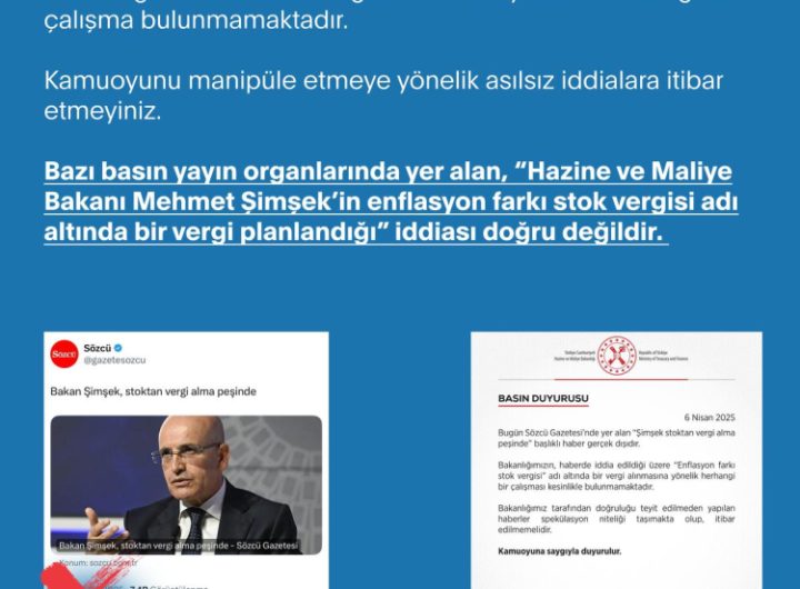 ANKARA (İGFA) –Hazine ve Maliye Bakanı Şimşek’in enflasyon farkına dair yeni bir vergi planlandığı iddiasına ilişkin açıklama...
