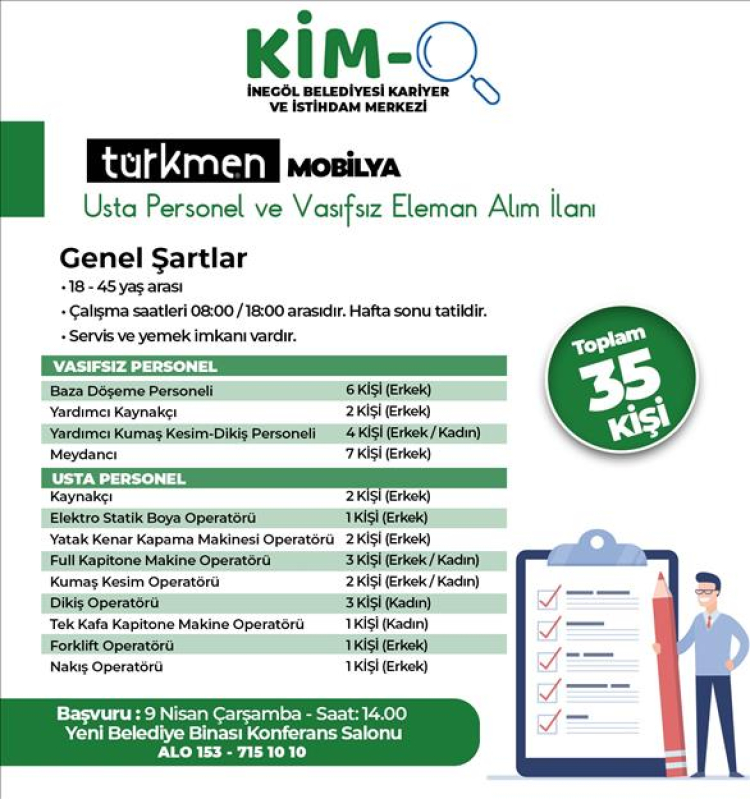 “Türkmen Mobilya firması personel alımı için başvurular 09 Nisan Çarşamba günü 14.00’da İnegöl Belediyesi Yeni Hizmet Binası zemin katındaki çok amaçlı salonda alınacak. Yapılacak alımla ilgili detaylı bilgi almak isteyen vatandaşlar 153 hatları üzerinden ve 0 224 715 10 10 Nolu telefondan İnegöl Belediyesi İstihdam Merkezine ulaşabilirler.”