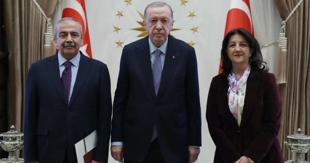 ANKARA (İGFA) – Cumhurbaşkanı Recep Tayyip Erdoğan, DEM Parti Van Milletvekili Pervin Buldan ve İstanbul Milletvekili Sırrı Süreyya Önder’den oluşan heyeti Cumhurbaşkanlığı Külliyesi’nde ağırladı.