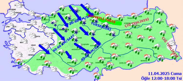 Öte yandan bugünkü hava tahmin raporunda Meteoroloji, kuvvetli yağış ve rüzgar ile zirai don ve çığ tehlikeleri konusunda da uyarılarda bulundu.