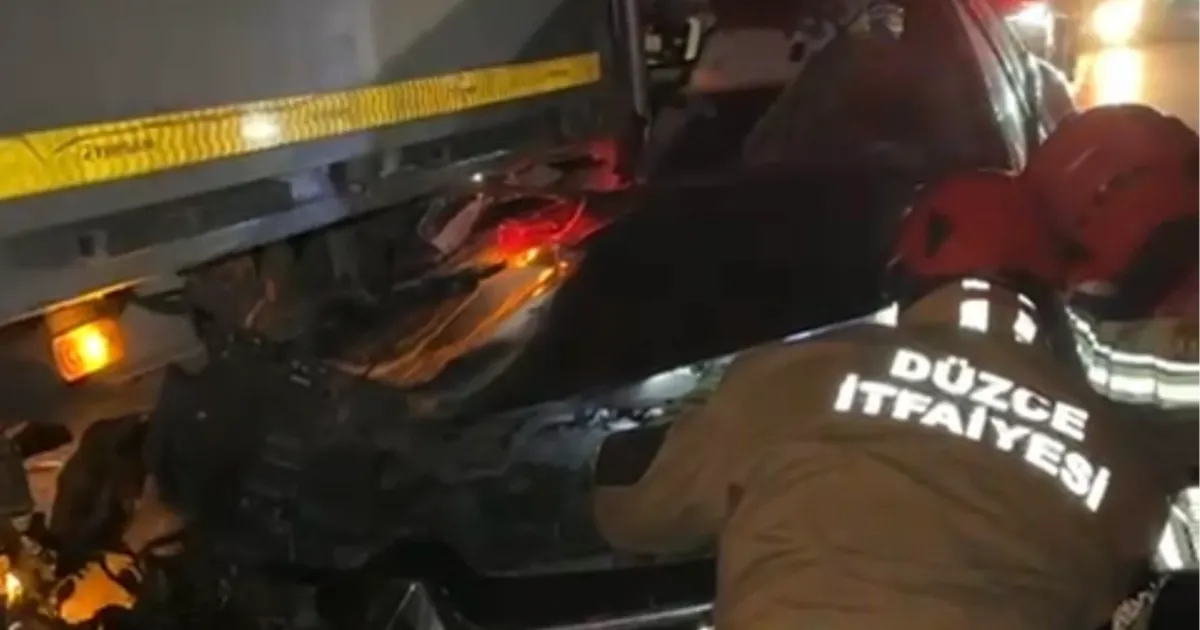 Sefer DEMİR / DÜZCE (İGFA) – Anadolu Otoyolu Düzce kesiminde U.T. idaresindeki 34 KHF 025 plakalı otomobil, İstanbul istikametinde seyrederken, otoyolun Düzce mevkisinde, aynı istikamette seyir halinde olan A.Y. yönetimindeki 19 ADV 984 plakalı tıra çarptı.