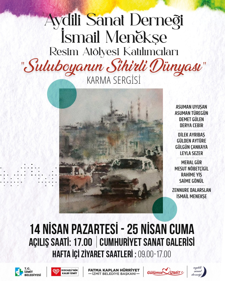 KOCAELİ (İGFA) – Kocaeli İzmit Belediyesi, kente sanatı taşıyan etkinliklerine bir yenisi daha ekliyor. Aydili Sanat Derneği bünyesinde faaliyet gösteren İsmail Menekşe Resim Atölyesi katılımcılarının eserlerinden oluşan “Suluboyanın Sihirli Dünyası” adlı karma sergi, 14 Nisan Pazartesi günü saat 17.00’de Cumhuriyet Sanat Galerisi’nde sanatseverlerle buluşacak.