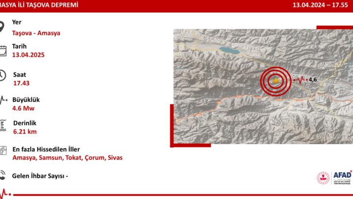 ANKARA (İGFA) – Afet ve Acil Durum Yönetimi Başkanlığının (AFAD), Amasya’nın Taşova ilçesinde 4,6 büyüklüğünde deprem meydana geldiğini...
