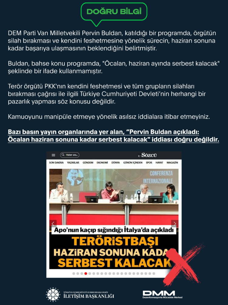Dezenformasyonla Mücadele Merkezi’nden yapılan açıklamada, “DEM Parti Van Milletvekili Pervin Buldan, katıldığı bir programda, örgütün silah bırakması ve kendini feshetmesine yönelik sürecin, haziran sonuna kadar başarıya ulaşmasının beklendiğini belirtmiştir. Buldan, bahse konu programda, “Öcalan, haziran ayında serbest kalacak” şeklinde bir ifade kullanmamıştır. Terör örgütü PKK’nın kendini feshetmesi ve tüm grupların silahları bırakması çağrısı ile ilgili Türkiye Cumhuriyeti Devleti’nin herhangi bir pazarlık yapması söz konusu değildir. Kamuoyunu manipüle etmeye yönelik asılsız iddialara itibar etmeyiniz” ifadeleri yer aldı.