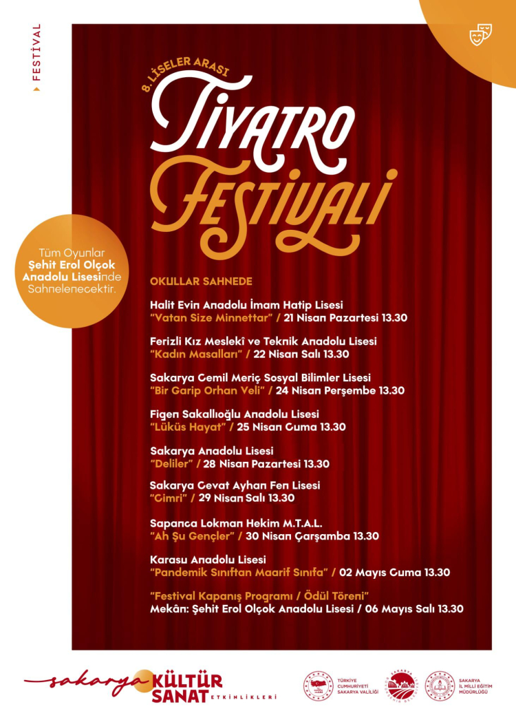 Festival kapsamında il genelinden 8 farklı lise, yıl boyunca hazırladıkları tiyatro oyunlarıyla sahneye çıkacak. Tüm gösterimler, Şehit Erol Olçok Anadolu Lisesi Konferans Salonu’nda saat 13.30’da izleyiciyle buluşacak.