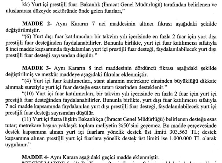 ANKARA (İGFA) – Ticaret Bakanlığı’nca yürütülen İhracat Destekleri Hakkındaki Cumhurbaşkanı Kararı’nda değişiklik yapıldı. Bugünkü Resmi Gazete’de yayımlanan...