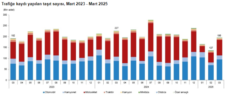 Mart ayında trafiğe kaydı yapılan taşıt sayısı bir önceki aya göre motosiklette yüzde 58,2, kamyonette yüzde 50,7, otomobilde yüzde 38,1, kamyonda yüzde 19,6, traktörde yüzde 8,7 artarken otobüste yüzde 25,2, minibüste yüzde 21,3 ve özel amaçlı taşıtta yüzde 13,0 azaldı.