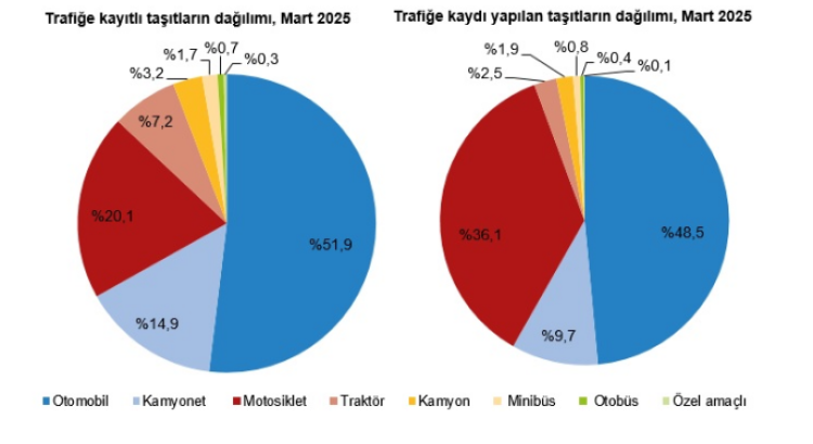 Mart ayında trafiğe kaydı yapılan taşıtların yüzde 48,5’ini otomobil, yüzde 36,1’ini motosiklet, yüzde 9,7’sini kamyonet, yüzde 2,5’ini traktör, yüzde 1,9’unu kamyon, yüzde 0,8’ini minibüs, yüzde 0,4’ünü otobüs ve yüzde 0,1’ini özel amaçlı taşıtlar oluşturdu.