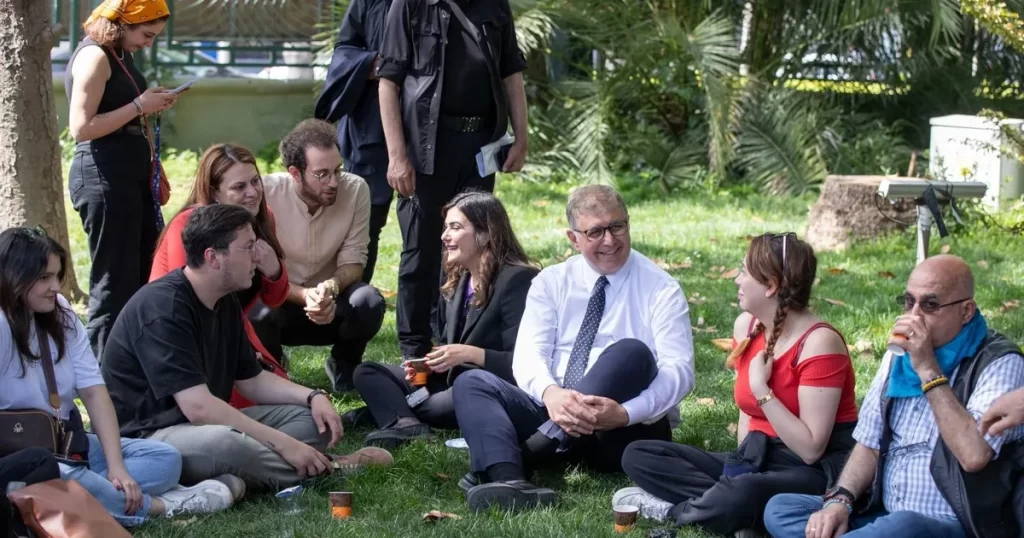 Kültürpark Lozan Kapısı’nın iç bölümünde bulunan alanda gençlerle oturan Başkan Dr. Cemil Tugay, uzun bir sohbet gerçekleştirdi.