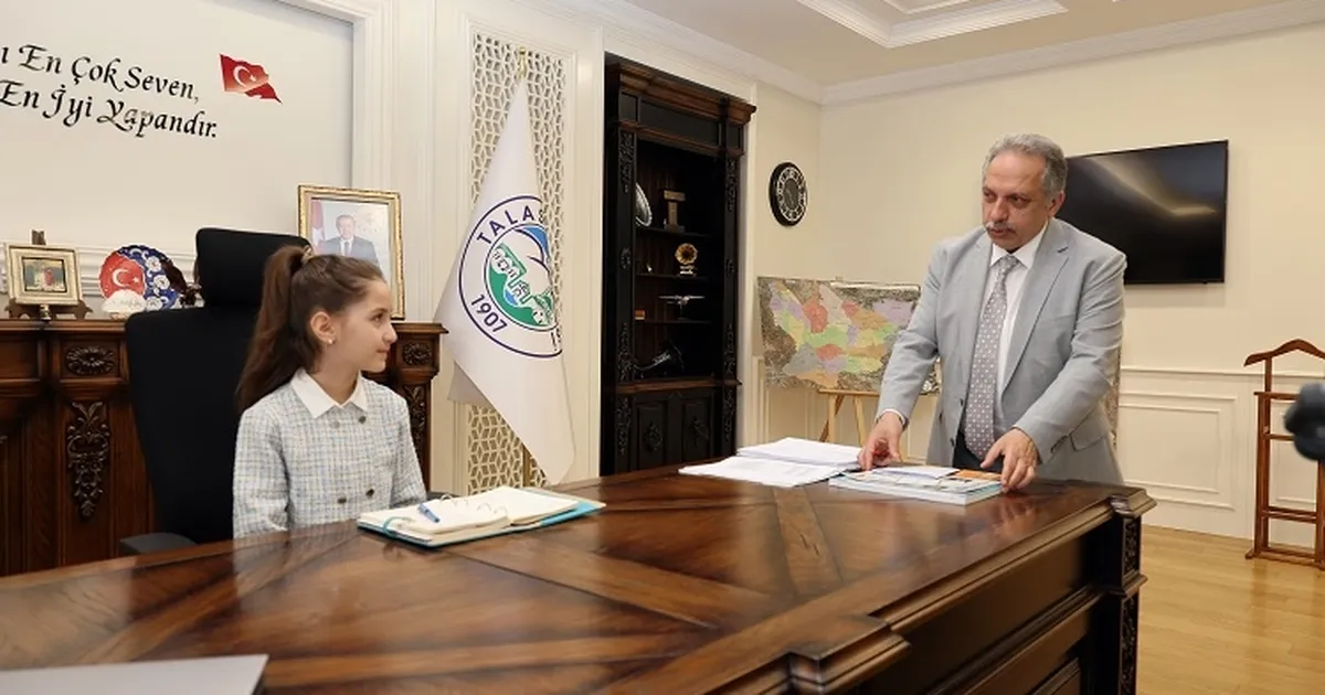 KAYSERİ (İGFA) – Kayseri Talas Belediyesi başkanlık makamındaki ziyarette TOKİ Levent Çetinkaya İlkokulu Müdür Yardımcısı Nilüfer Yanmaz, rehber öğretmeni Fatma Balaban ile 4. sınıf öğrencileri Ahmet Akif Özimamoğlu ve Gülce Duru Tekdemir ile 3. sınıf öğrencisi Giray Emir Tekkal hazır bulundu.