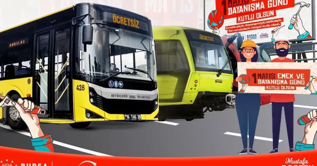 Bursa Büyükşehir Belediyesi olarak emeğin ve emekçinin yanında olmaya devam edeceklerini söyleyen Başkan Mustafa Bozbey, “1 Mayıs Emek ve Dayanışma Günü’nde kutlama ve etkinliklerin coşkulu kalabalıklarla yapılabilmesi amacıyla BursaRay ve tramvay hatları ile resmi plakalı Burulaş otobüsleri, 1 Mayıs 2025 Perşembe günü 08.00 ile 18.00 saatleri arasında BursaKart kullanmak suretiyle ücretsiz olarak hizmet verecektir” dedi.