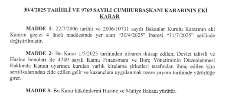 Böylelikle devlet tahvili ve Hazine bonolarından elde edilen gelirler ile 4749 Sayılı Kanun uyarınca varlık kiralama şirketlerinin ihraç ettiği kira sertifikalarından sağlanan gelirlerde indirimli tevkifat oranı (yüzde 0) uygulaması 31 Temmuz 2025’e kadar devam edecek.