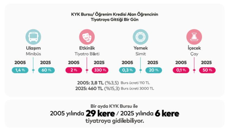 • Kısıtlanan Sosyal ve Kültürel Yaşam: Artan yaşam maliyetleri, gençlerin sosyal ve kültürel etkinliklere katılımını ciddi şekilde sınırlıyor. 20 yıl önce canlı kampüs hayatı ve erişilebilir kültürel etkinlikler yaygınken, bugün gençler tiyatroya (%15,3 burs oranıyla ayda 6 kez) veya konsere (%46,5 burs oranıyla ayda 2 kez) gitmekte zorlanıyor. İBB’nin kamusal alanları, gençler için “nefes alınabilen” nadir yerler olarak öne çıkıyor.
