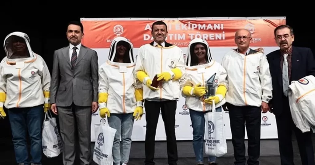 DENİZLİ (İGFA) – Denizli’de Çatalçeşme Oda Tiyatrosu’nda düzenlenen törene Denizli Büyükşehir Belediye Başkanı Bülent Nuri Çavuşoğlu’nun yanı sıra, Genel Sekreter Bülent Bozbaş, Kırsal Hizmetler Dairesi Başkanı Yücel Arazsu, Denizli Arıcılar Birliği Başkanı Nihat Çomak ve çok sayıda arı yetiştiricisi katıldı. Programın ilk etabında Pamukkale, Merkezefendi, Sarayköy ve Babadağ ilçelerindeki arıcılara ekipmanların teslim edildiği törende konuşan Başkan Çavuşoğlu, arıcılığın tarım ve doğa açısından taşıdığı öneme dikkat çekerek, “Arıcılık biterse, tarım biter; tarım biterse, hayat sona erer. Bu anlayışla, ‘Bu şehrin kaynakları bu şehrin insanlarına aittir’ diyerek arı yetiştiricilerimizin yanında olmaya devam edeceğiz” dedi.