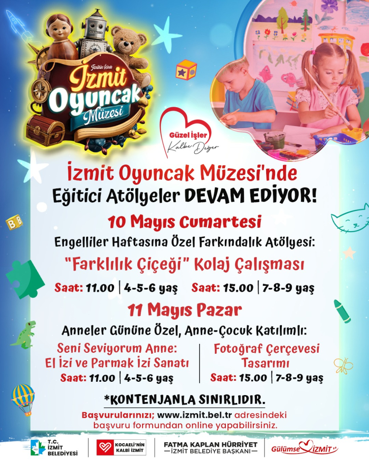 KOCAELİ (İGFA) – Kocaeli İzmit Belediyesi, çocuklara özel düzenlendiği yaratıcı atölye çalışmalarıyla keyifli ve öğretici bir deneyim sunmaya devam ediyor. İzmit Oyuncak Müzesi’nde Engelliler Haftasına özel 10 Mayıs Cumartesi günü saat 11.00’de 4-5-6 yaş grubuyla, saat 15.00’te 7 yaş grubuyla “Farklılık Çiçeği Kolaj Atölyesi” gerçekleştirecek. 20’şer kişilik kontenjanlar ayrılan atölyede mukavva, boyalar, elişi kâğıdı, eva kâğıdı, fon kartonu gibi malzemeler kullanılacak.