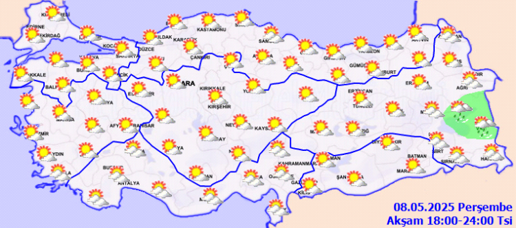 ANKARA (İGFA) – Meteoroloji Genel Müdürlüğü, 8 Mayıs Perşembe gününe ilişkin hava tahmin raporunu yayımladı. Buna göre ülkemiz genelinin parçalı ve çok bulutlu, Akdeniz’in Toroslar mevkii, Batı Karadeniz’in iç kesimleri, Orta ve Doğu Karadeniz, Doğu Anadolu ile Kırklareli, Kahramanmaraş, Karaman, Yozgat, Kayseri, Sivas, Niğde, Adıyaman, Diyarbakır, Batman ve Siirt çevreleri ile Antalya’nın iç kesimlerinin sağanak ve gök gürültülü sağanak yağışlı geçeceği tahmin ediliyor. Güney Ege ve Batı Akdeniz’de toz taşınımı bekleniyor.