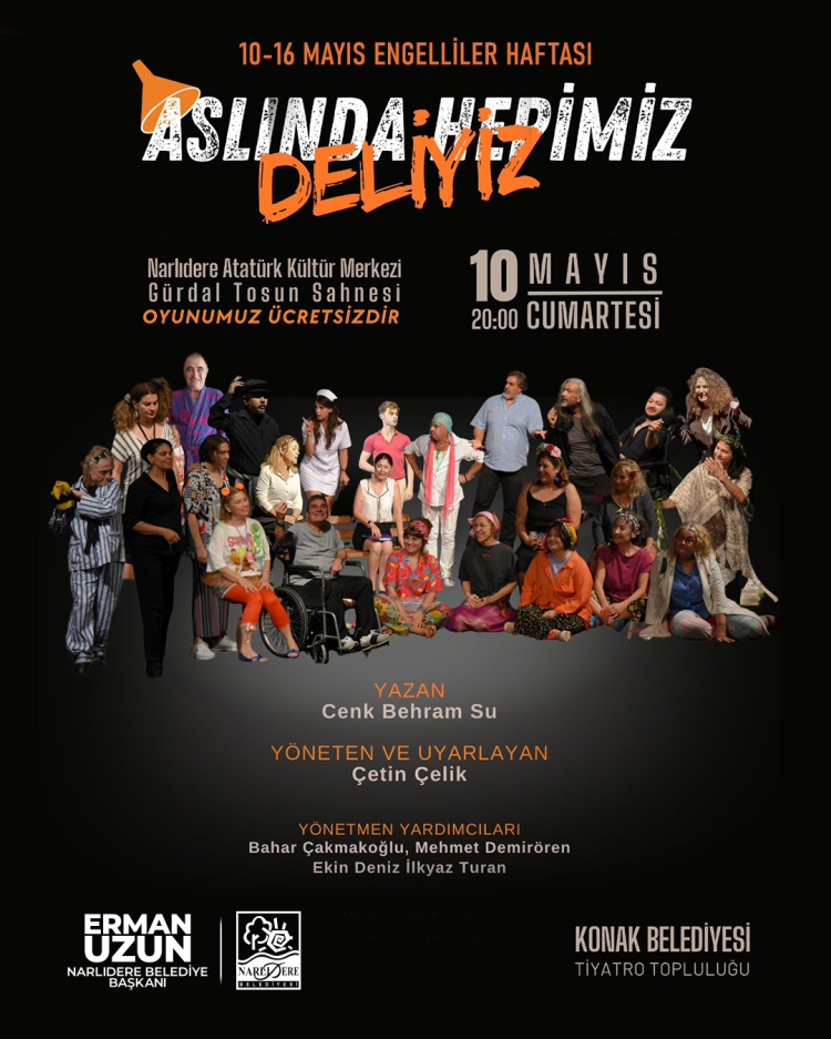 İZMİR (İGFA) – İzmir Narlıdere Belediyesi, 10-16 Mayıs Dünya Engelliler Haftası kapsamında farkındalık yaratmak, eşit yaşam hakkına dikkat çekmek ve engelli bireylerin başarı hikâyelerini görünür kılmak amacıyla iki özel etkinlik düzenleyecek. Engelliler Haftası etkinliklerinin ilki, 10 Mayıs Cumartesi günü saat 20.00’de Atatürk Kültür Merkezi Tiyatro Salonu’nda sahnelenecek olan “Aslında Hepimiz Deliyiz” adlı tiyatro oyunu olacak. Konak Belediyesi Tiyatro Topluluğu’nun sahneleyeceği oyun öncesinde, kendisi de engelli bir birey olan Erkan Kızıldağ, engelli bireylerin yaşadığı sorunları anlatan bir konuşma yapacak.