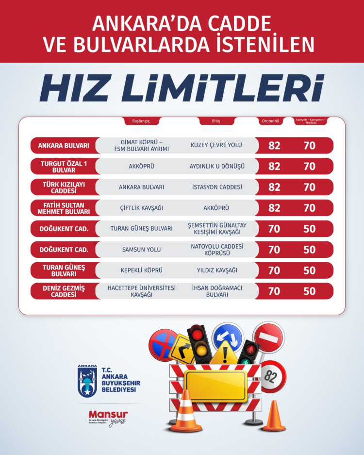 ANKARA (İGFA) – Ankara Büyükşehir Belediyesi, şehirdeki cadde ve bulvarlarda geçerli hız sınırlarıyla ilgili sürücülere önemli bir hatırlatma yaptı.