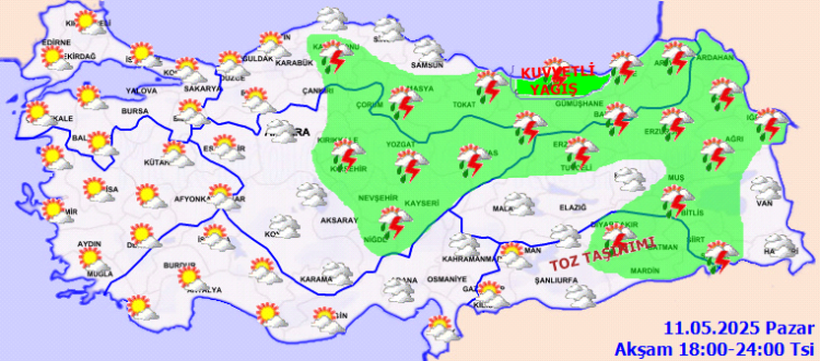 Meteoroloji, yaşanabilecek olumsuzluklara karşı kuvvetli yağış ve kuvvetli rüzgarın yanı sıra toz taşınımı uyarısında bulundu.