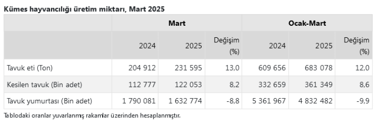 Geçen yılın aynı ayına göre tavuk eti üretimi yüzde 13, kesilen tavuk sayısı yüzde 8,2 artarken, yumurta üretimi yüzde 8,8 azaldı. Ocak-Mart 2025 döneminde ise tavuk eti üretimi yüzde 12, kesilen tavuk sayısı yüzde 8,6 artarken, yumurta üretimi yüzde 9,9 geriledi.