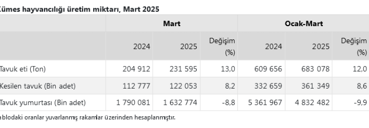ANKARA (İGFA) – TÜİK, Mart ayına ilişkin kümes hayvancılığı verilerini açıkladı. Mart 2025’te tavuk eti üretimi 231...