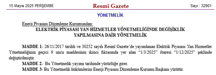 ANKARA (İGFA) – EPDK, 26 Kasım 2017 tarihli Elektrik Piyasası Yan Hizmetler Yönetmeliği’nde yapılan değişikliği bugünkü Resmî Gazete’de yayımladı.