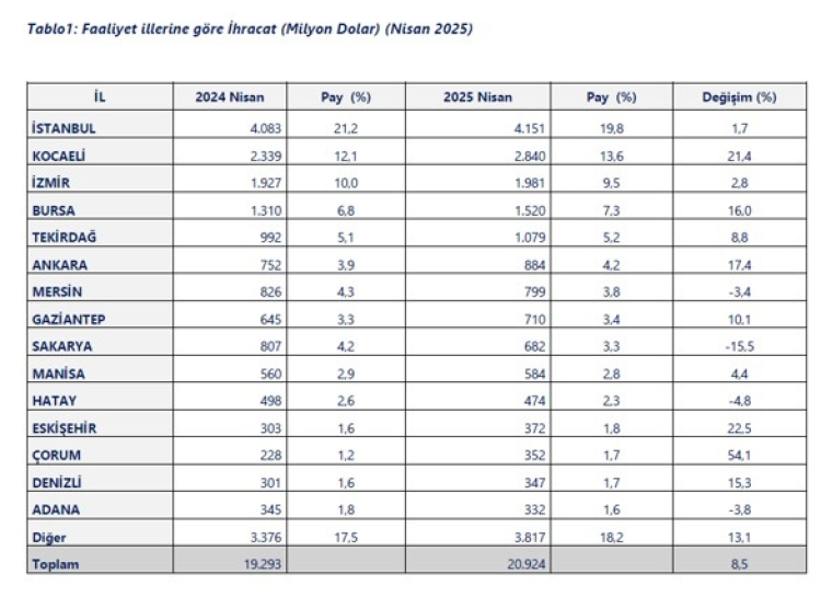 Buna göre Nisan ayı ihracat liderlerinde İstanbul 4 milyar 151 milyon dolar, Kocaeli 2 milyar 840 milyon dolar, İzmir 1 milyar 981 milyon dolar, Bursa 1 milyar 520 milyon dolar, Tekirdağ 1 milyar 79 milyon dolar oldu.