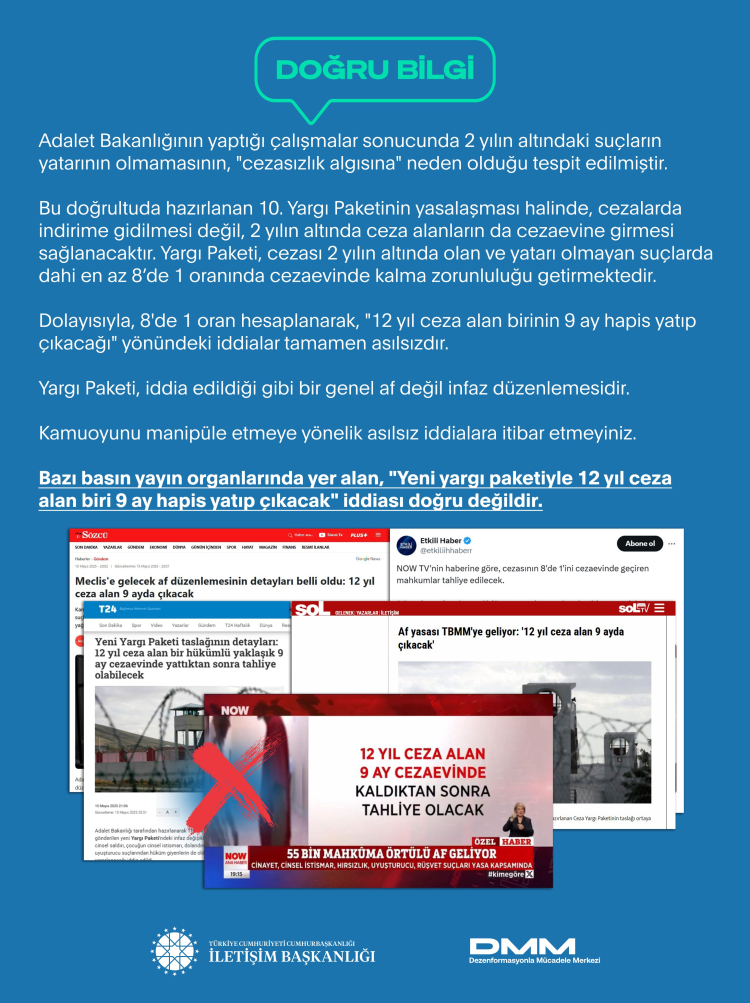 İletişim Başkanlığı’ndan yapılan açıklamada, “12 yıl ceza alan birinin 9 ay hapis yatıp çıkacağı” iddiasının tamamen asılsız olduğunu, bu tür hesaplamaların gerçeği yansıtmadığını belirtilirken, Yargı Paketi’nin genel af değil, infaz sisteminde düzenleme amacı taşıdığı ifade edildi. Paketin yasalaşması halinde, cezaların daha etkin uygulanması ve cezasızlık algısının kırılması hedefleniyor.