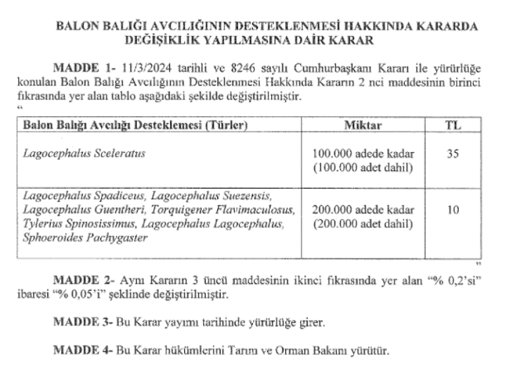 ANKARA (İGFA) – Balon Balığı Avcılığının Desteklenmesi Hakkında Kararda değişiklik yapan Cumhurbaşkanı Kararı, bugünkü Resmi Gazete’de yayımlanarak...