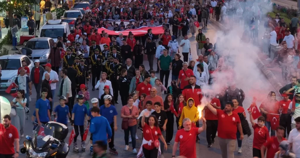KOCAELİ (İGFA) – Kocaeli Büyükşehir Belediyesi tarafından 2022 yılında yaptırılan ve yaklaşık 1,5 km uzunluğunda olan; İzmit Merkez Bankası önünden başlayarak Milli İrade Meydanı’na kadar uzanan Cumhuriyet Bulvarı bu akşam tarihi günlerinden birini yaşadı. Kocaeli Büyükşehir Belediyesi tarafından 19 Mayıs Atatürk’ü Anma, Gençlik ve Spor Bayramı kutlamaları kapsamında bu akşam Cumhuriyet Bulvarı’nda “19 Mayıs Korteji” yürüyüşü yapıldı. Vatandaşların yoğun ilgi gösterdiği yürüyüşe binlerce kişi katıldı. Kortejin başı Milli İrade Meydanı’na ulaştığında ucu gözükmüyordu, başlangıç noktası Merkez Bankası önüne kadar uzanıyordu. Kocaeli Valisi İlhami Aktaş ile Kocaeli Büyükşehir Belediye Başkanı Doç.Dr.Tahir Büyükakın’ın da katıldığı kortejde Türk Bayrağı ve Atatürk posterleri taşındı. Kortejin tamamı alana ulaşana kadar saatler geçti. Alandaki Fatma Turgut konseri kortejin sonu alana ulaşana kadar başlamadı. Kortejin alandaki kalabalıkla buluştuğu anlar görülmeye değerdi.