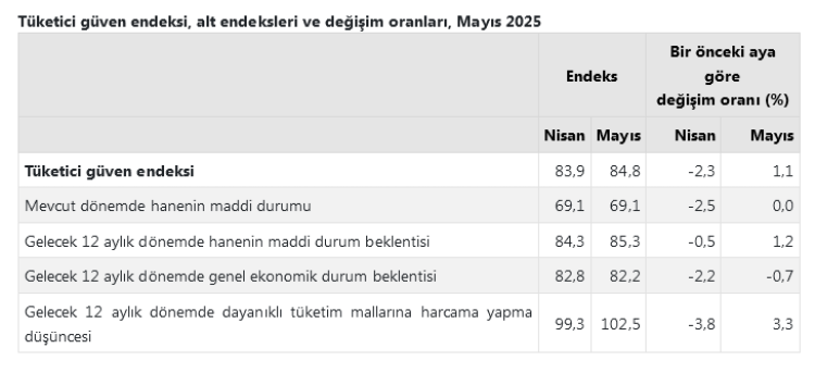 Tüketici güven endeksi, Nisan 2025’te 83,9 seviyesindeyken, Mayıs 2025’te yüzde 1,1’lik bir artışla 84,8’e ulaştı.