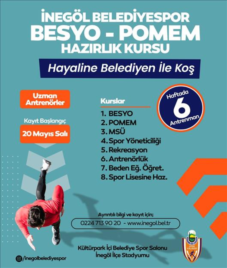 Kurs kayıtları 20 Mayıs Salı günü itibariyle başladı. Gençlerin yoğun ilgi gösterdiği hazırlık kurslarına katılmak isteyen vatandaşlar, detaylı bilgi ve başvuru işlemleri için 0224 713 90 20 numaralı telefondan İnegöl Belediyespor ile iletişime geçebilir, Kültür Park içi Belediyespor Salonunu ziyaret edebilirler.