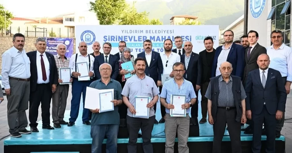 Törende konuşan ve “Bu anlamlı gün, sadece bir tapu dağıtım töreni değil, aynı zamanda yıllardır süren bir emeğin, sabrın ve dayanışmanın meyvesini toplama anıdır” diyen Yıldırım Kaymakamı Metin Esen de, “Şirinevler Mahallesi, ilçemizin en dinamik ve değerli bölgelerinden biridir. Burada yaşayan her bir vatandaşımızın huzuru, refahı ve güvenliği, bizim için her zaman öncelik olmuştur. Tapu, bir evin, bir yuvanın sadece fiziki bir belgesi değil; aynı zamanda bir ailenin geleceğe güvenle bakmasının, çocuklarına sağlam bir miras bırakmasının teminatıdır. Bugün, bu törenle, siz değerli mahalle sakinlerimizin uzun süredir beklediği bu önemli adımı atmanın mutluluğunu yaşıyoruz. Bu süreçte, devletimizin tüm kurumları, yerel yönetimlerimiz ve ilgili kuruluşlarımız büyük bir özveriyle çalışmıştır. Emeği geçen herkese, özellikle tapu işlemlerinin hızlı ve sağlıklı bir şekilde tamamlanmasını sağlayan ekiplere, huzurlarınızda teşekkür ediyorum” ifadelerini kullandı.