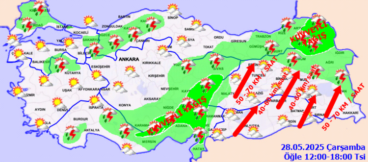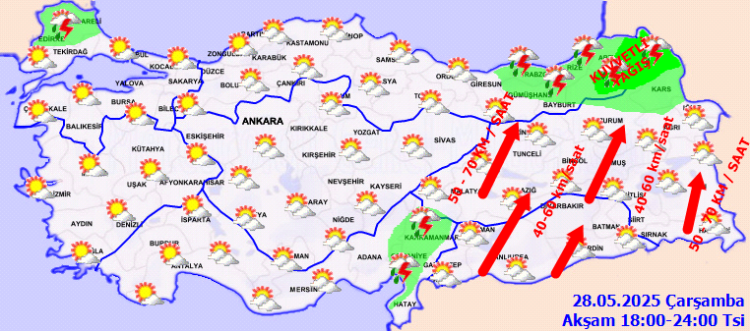 Yağışların; Adana ve Mersin’in kuzeyi, Osmaniye çevreleri, Kahramanmaraş’ın kuzey ve batısı, Hatay’ın kuzey ilçeleri, Sivas’ın güneyi, Malatya’nın kuzey ve batısı, Kayseri ve Niğde’nin güney ve doğusu ile Aksaray ve Nevşehir çevreleri, Ardahan ve Kars çevreleri, Artvin’in iç kesimleri ile Erzurum’un doğu ilçelerinde yerel kuvvetli olması bekleniyor. Rüzgarın; doğu bölgelerde güney ve güneybatı yönlerden kuvvetli ve yer yer fırtına olarak (50-70 km/saat) esmesi tahmin ediliyor.