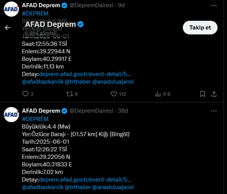ANKARA (İGFA) – Afet ve Acil Durum Yönetimi Başkanlığı’ndan alınan bilgiye göre, Bingöl’ün merkez üssü Kiğı ilçesinde saat 12.26’da 4,4, saat 12.55’te ise 3,6 büyüklüğünde iki ayrı sarsıntı kaydedildi.