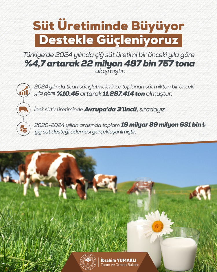 Bakan Yumaklı, paylaşımında, inek sütü üretiminde Avrupa’da üçüncü sırada olunduğunu belirterek, 2020-2024 yılları arasında toplam 19 milyar 89 milyon 631 bin lira çiğ süt desteği ödemesinin gerçekleştirildiğini kaydetti.