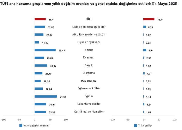 Tüketici Fiyat Endeksi (TÜFE), Mayıs 2025’te bir önceki aya göre yüzde 1,53, geçen yılın aynı ayına göre yüzde 35,41 yükseldi.