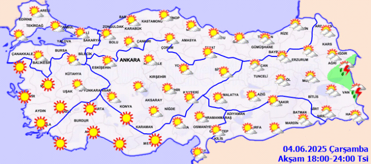 ANKARA (İGFA) – Meteoroloji Genel Müdürlüğü’nün 4 Haziran Çarşamba günü tahminlerine göre, Türkiye’nin iç ve doğu kesimlerinde hava parçalı ve yer yer çok bulutlu olacak.