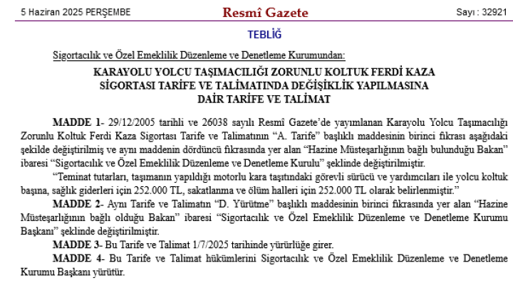 ANKARA (İGFA) – Resmi Gazete’de yayımlanan “Karayolu Yolcu Taşımacılığı Zorunlu Koltuk Ferdi Kaza Sigortası Tarife ve Talimatında...