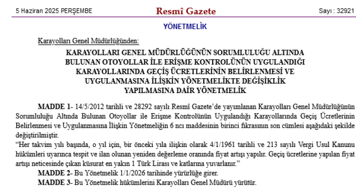ANKARA (İGFA) – Resmi Gazete’nin bugünkü sayısında yayımlanan “Karayolları Genel Müdürlüğünün Sorumluluğu Altında Bulunan Otoyollar ile Erişme...