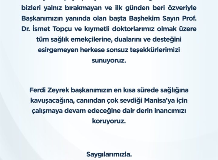 MANİSA (İGFA) – Manisa Büyükşehir Belediye Başkanı Mimar Ferdi Zeyrek, 6 Haziran akşamı evinde geçirdiği talihsiz bir...