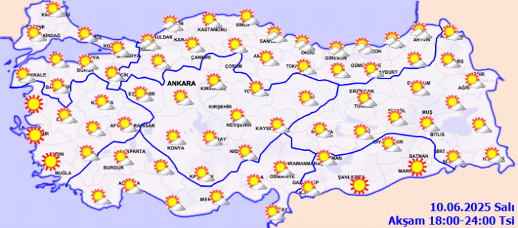 ANKARA (İGFA) – Meteoroloji Genel Müdürlüğü 10 Haziran Salı gününe ilişkin hava tahmin raporunu yayımladı.