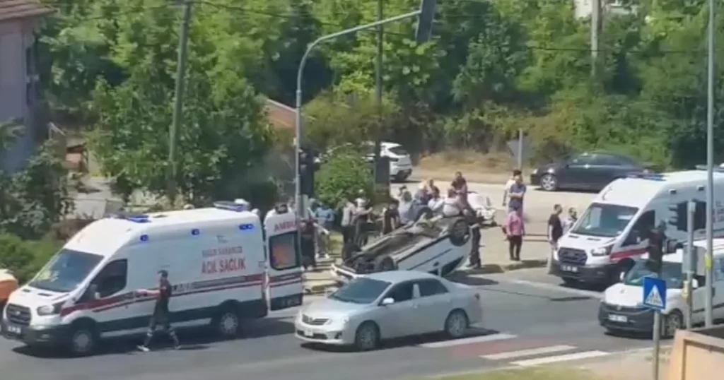 Çarpmanın etkisiyle araç takla atarken, kazada otomobilde bulunan K.G. ve Y. M. ile yaya geçidinde savrulan N.Ö. yaralandı.