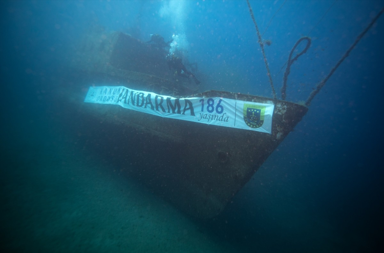 Yaklaşık 30 metre derinlikte bulunan vapurun burun kısmında, “Kanun Ordusu Jandarma 186 Yaşında” yazılı pankart açıldı. Ekipler, su altında Türk bayrağı ve Atatürk portresi de açarak saygı duruşunda bulundu.