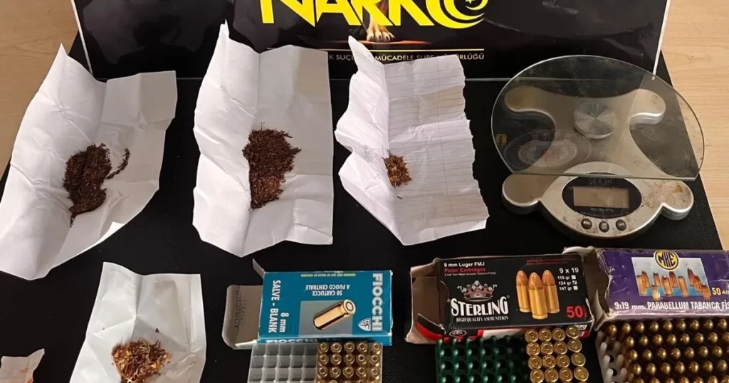 Aramalarda, 5 parça halinde toplam 15 gram sentetik kannabinoid (bonzai), 1 gram metamfetamin, 1 hassas terazi, uyuşturucu kullanımına yarayan 1 cam aparat, 61 adet 9×19 mm tabanca fişeği ve 28 adet kuru sıkı fişeği bulundu.