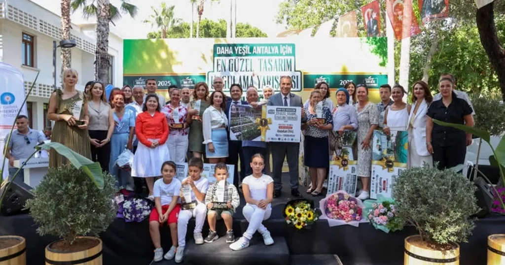ANTALYA (İGFA) – Antalya Büyükşehir Belediyesi tarafından çevre bilincini ve çevre sevgisini arttırmak, yaşanılan çevrenin görsel niteliğini desteklemek, halkın çevre düzenleme ve kent peyzajına yönelik ilgisini teşvik etmek amacıyla düzenlenen “Daha Yeşil Antalya İçin En Güzel Tasarım ve Uygulama Yarışmasında” dereceye giren peyzaj çalışmaları, ödüllendirildi. Antalya Büyükşehir Belediyesi Çevre Eğitim ve İnovasyon Merkezi bahçesinde gerçekleştirilen törene, Antalya Büyükşehir Belediyesi Genel Sekreter Yardımcısı Cemil Böcek, daire başkanları, STK temsilcileri, ilçe belediye temsilcileri, oda başkanları, yarışmacılar ve çok sayıda vatandaş katıldı.