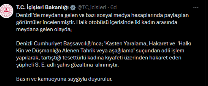ANKARA (İGFA) – Denizli’de bir halk otobüsünde yaşanan ve sosyal medyada geniş yankı bulan olayda, tesettürlü bir...