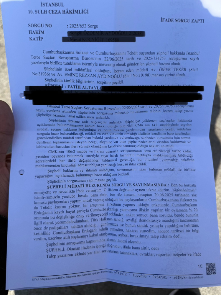 İSTANBUL (İGFA) – Gazeteci Fatih Altaylı, 22 Haziran 2025 tarihinde İstanbul Adliyesi’ne sevk edilmesinin ardından “Cumhurbaşkanına suikast” (TCK 310/2) ve “Cumhurbaşkanını tehdit” (TCK 106/1) suçlamalarıyla tutuklandı. Savcılık, Altaylı’nın bir programda sarf ettiği sözleri bu suçlara delil olarak değerlendirdi.