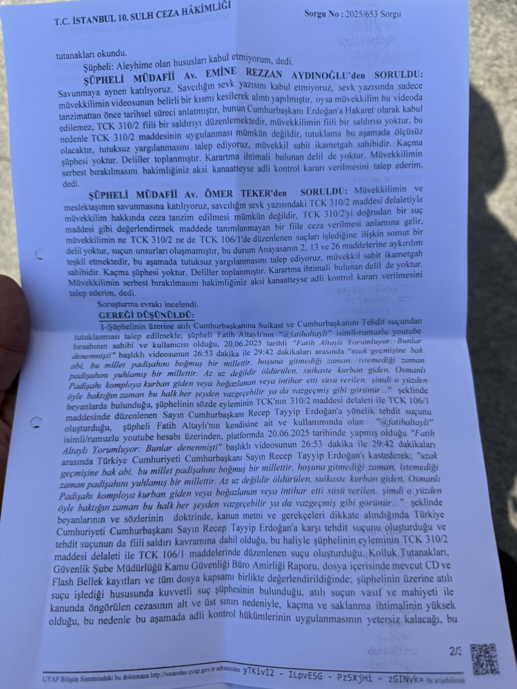 İSTANBUL (İGFA) – Gazeteci Fatih Altaylı, 22 Haziran 2025 tarihinde İstanbul Adliyesi’ne sevk edilmesinin ardından “Cumhurbaşkanına suikast” (TCK 310/2) ve “Cumhurbaşkanını tehdit” (TCK 106/1) suçlamalarıyla tutuklandı. Savcılık, Altaylı’nın bir programda sarf ettiği sözleri bu suçlara delil olarak değerlendirdi.