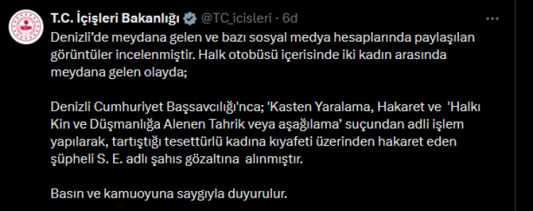 ANKARA (İGFA) – Denizli’de bir halk otobüsünde yaşanan ve sosyal medyada geniş yankı bulan olayda, tesettürlü bir kadına yönelik hakaret ve tartışma olayıyla ilgili İçişleri Bakanlığı açıklama yaptı. Bakanlık, Denizli Cumhuriyet Başsavcılığı’nın harekete geçtiğini ve şüpheli S.E.’nin gözaltına alındığını duyurdu.